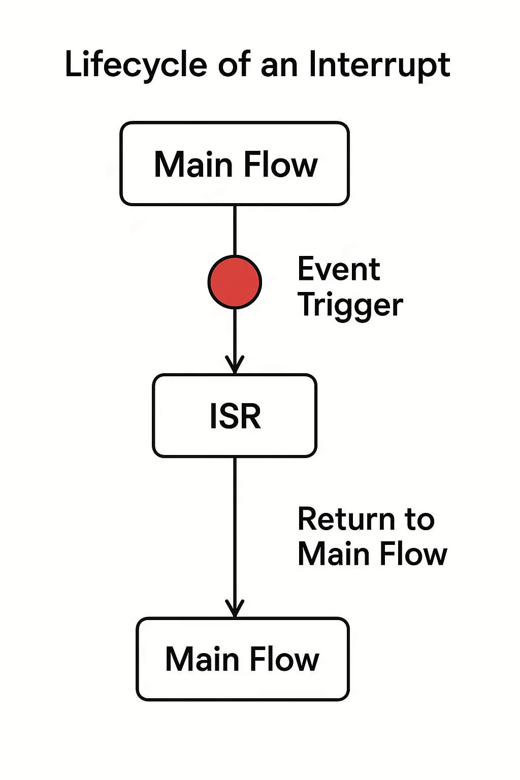 - Interrupt Service Routine (ISR): A small routine runs to service the event (e.g. reading a sensor or updating the display) and clears the interrupt flag.